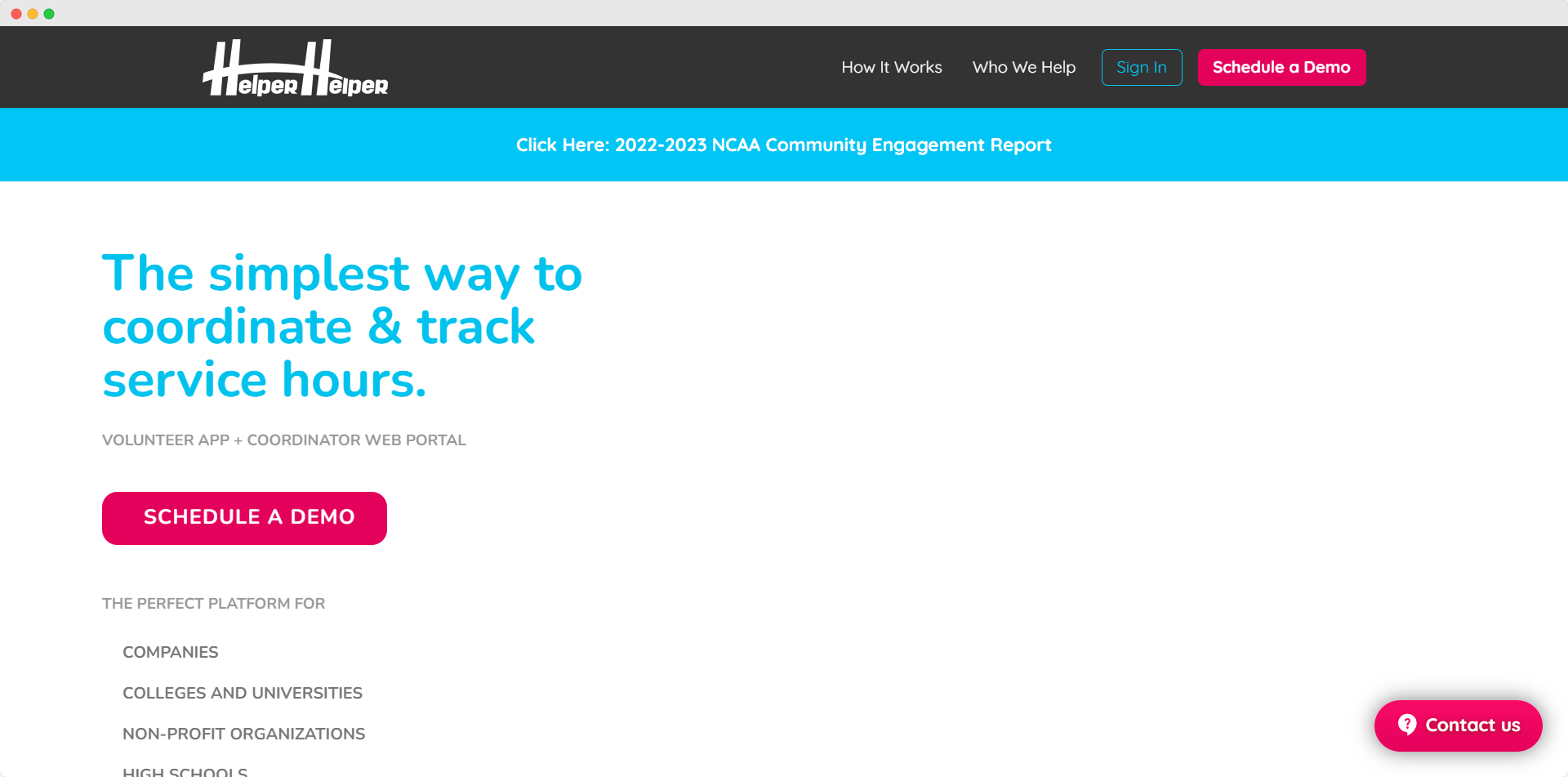 Helper Helper makes coordinating community service easy for nonprofits. It includes an activity dashboard for a quick overview, activity and attendance tracking to monitor participation, and tools for calendar and communication management to keep everyone informed.
